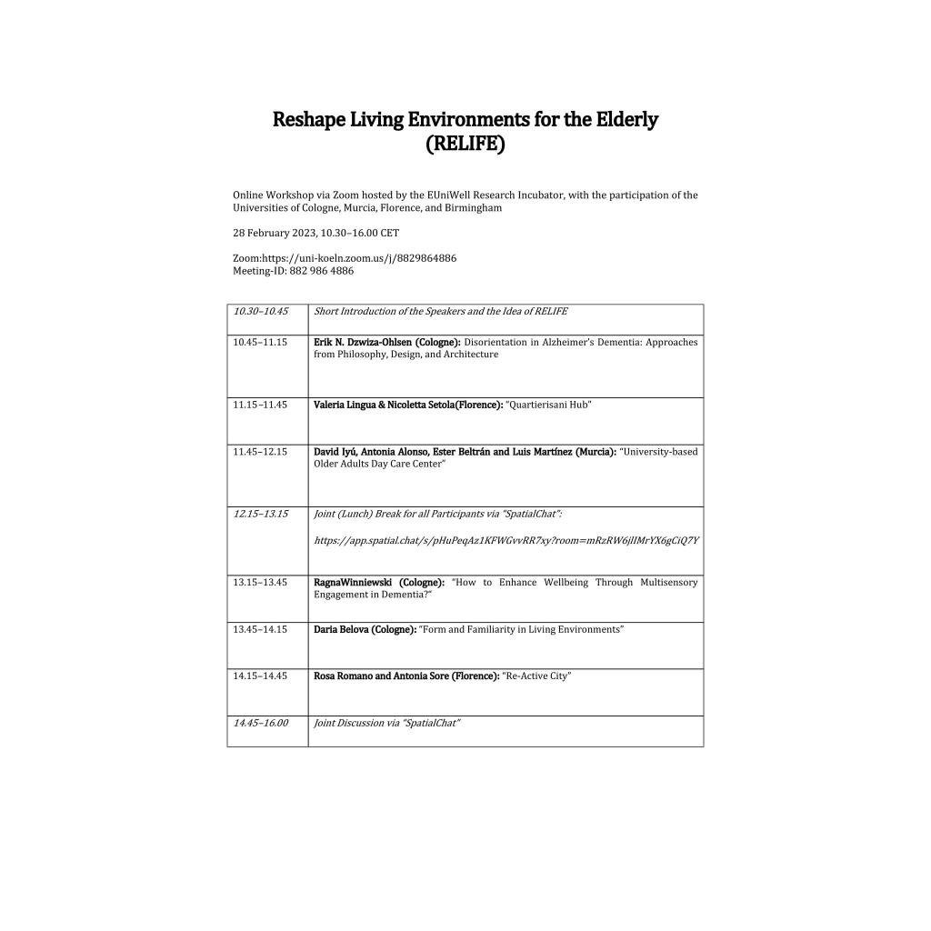 On 28 February 2023 at 10:30–16.00 CET / 09:30 – 15:00 GMT, we organised a collaborative online workshop , with the participation of experts from the intersection of philosophy and architecture from the Universities of Cologne, Florence, and Murcia. The workshop explored how older people live in urban environments and how their quality of life can be specifically improved. The variety of lectures mapped the dynamic relationship between older people and their environment by means of concepts such as perception, orientation, movement, activity, familiarity, and care. The workshop may be of particular interest to people from disciplines at the intersection of philosophy and architecture, such as doctors, psychiatrists, designers, sociologists, ethnologists, nursing and environmental scientists.